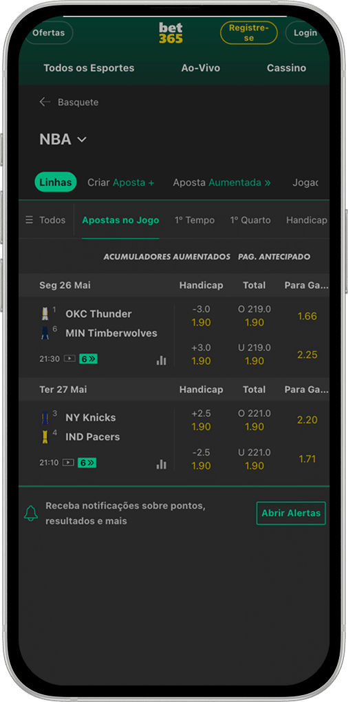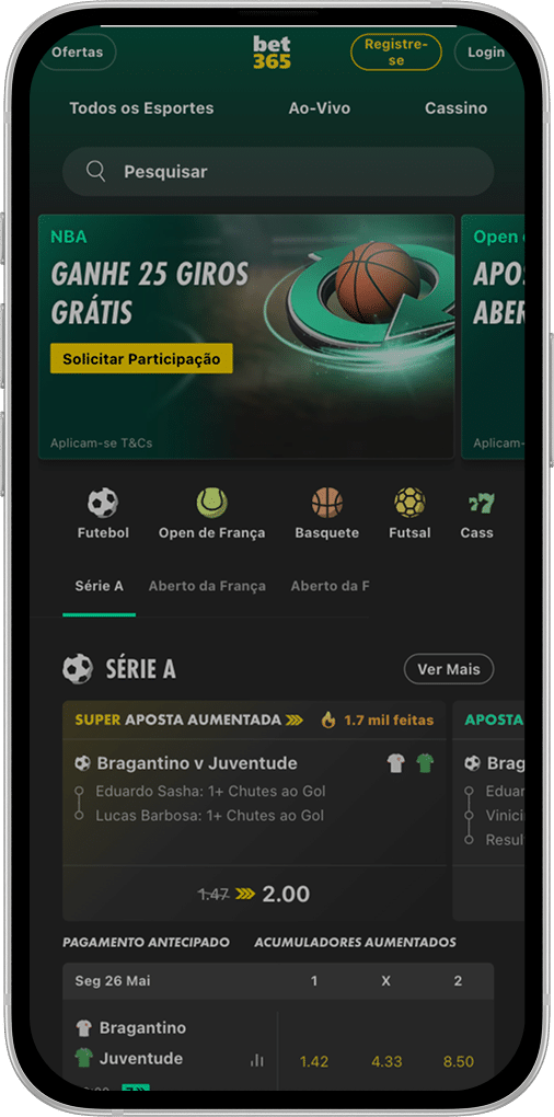 O aplicativo da Bet365 possui algumas promoções para apostas esportivas, como pagamento antecipado para alguns esportes, com destaque para futebol e basquete.