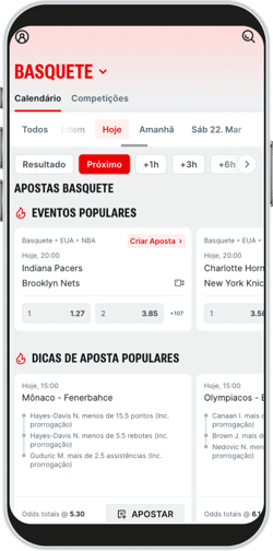 O app da Superbet transmite todos os jogos da temporada da NBA, permitindo que em uma única página você acompanhe a partida enquanto dá seus palpites.